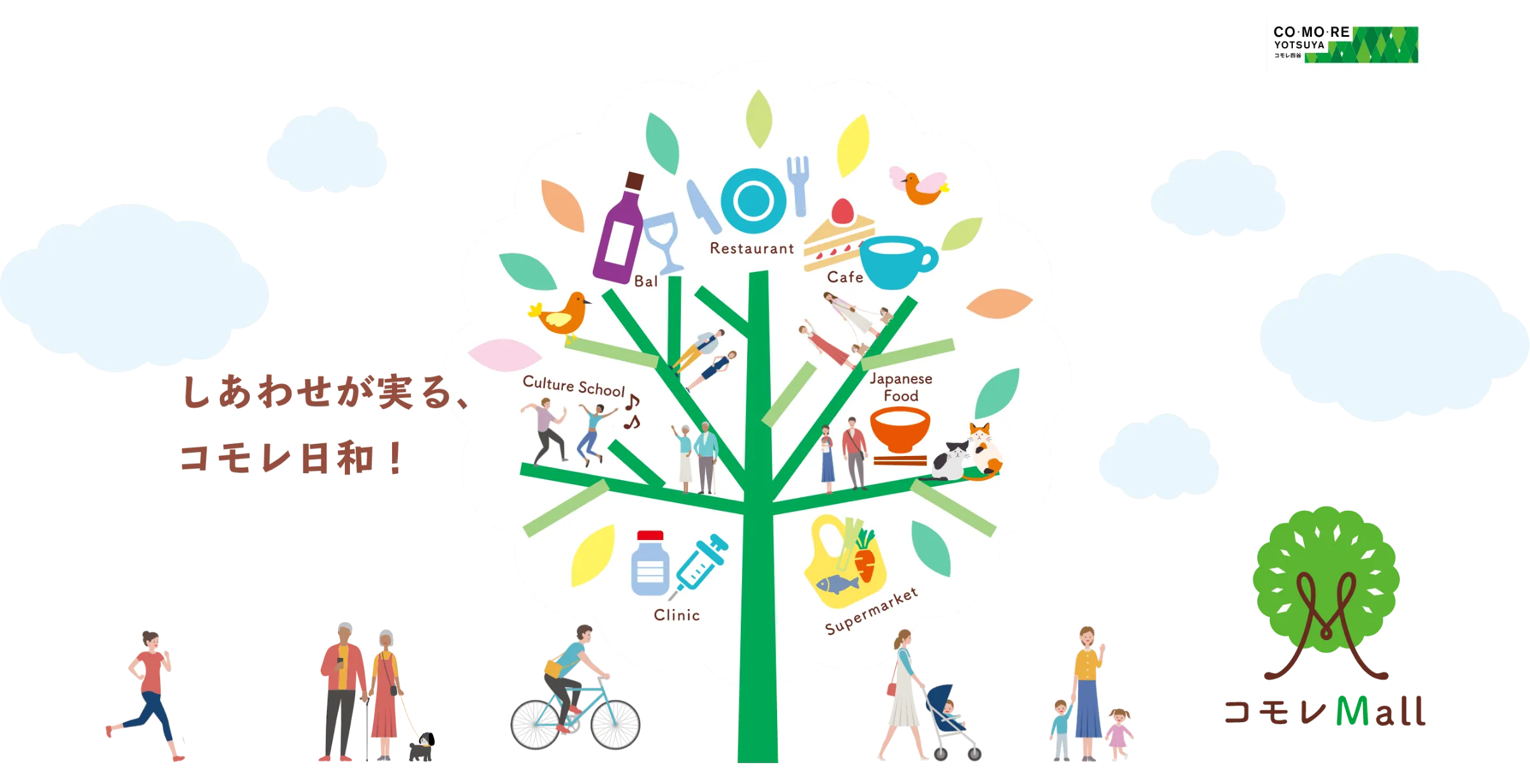 「CO・MO・RE Mall(コモレモール)」には、コンビニエンスストア・食品スーパー・ドラッグストア・100円ショップ等のデイリー物販のほか、クリニック・携帯キャリア・クリーニング等、幅広い店舗が集積し、地域の生活利便性に貢献しています。